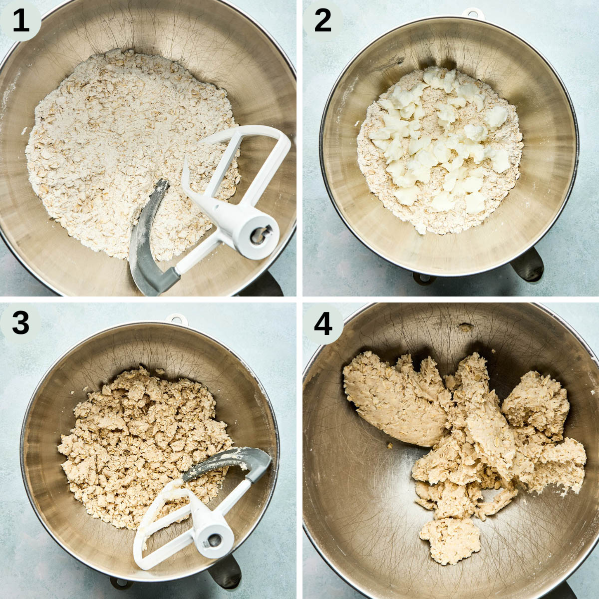 - Transfer the oats to the bowl of a stand mixer. Add the flour, sugar, baking soda, and salt. Stir on low speed with the paddle attachment until well combined.